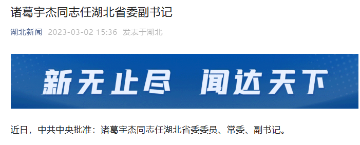 诸葛宇杰同志任湖北省委副书记。