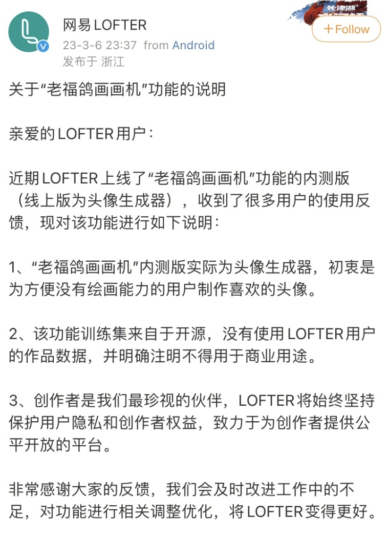 3月6日晚,网易LOFTER发布关于“老福鸽画画机”功能的说明。