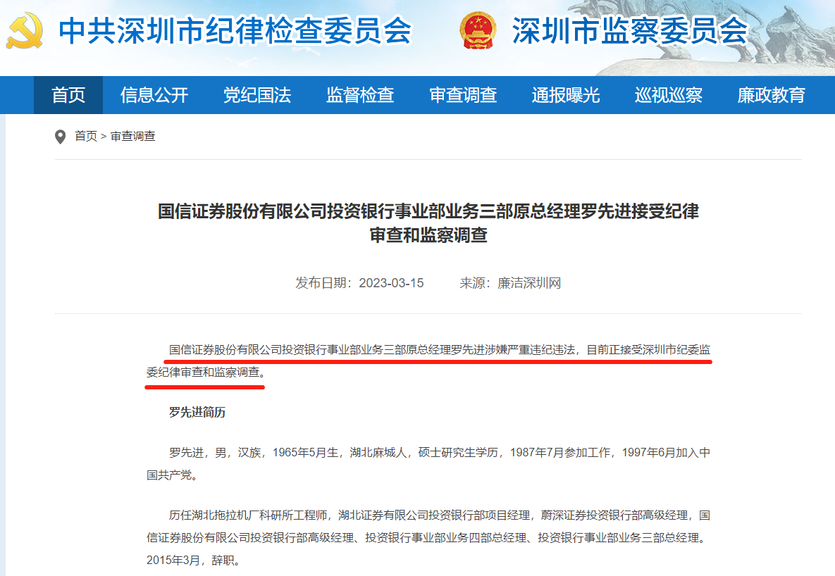 廉洁深圳网显示,国信证券投资银行事业部业务三部原总经理罗先进涉嫌严重违纪违法,目前正接受深圳市纪委监委纪律审查和监察调查。罗先进,1965年5月生,湖北麻城人,硕士研究生学历,1987年7月参加工作,1997年6月加入中国共产党。历任湖北拖拉机厂科研所工程师,湖北证券投资银行部项目经理,蔚深证券投资银行部高级经理,国信证券投资银行部高级经理、投资银行事业部业务四部总经理、投资银行事业部业务三部总经理。2015年3月辞职。