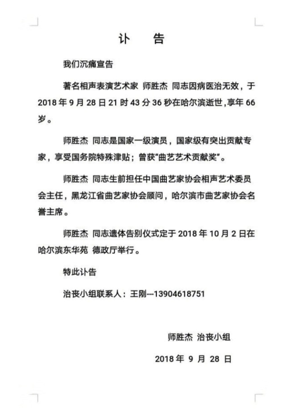 著名相声表演艺术家师胜杰于28日在哈尔滨因病去世,享年66岁。