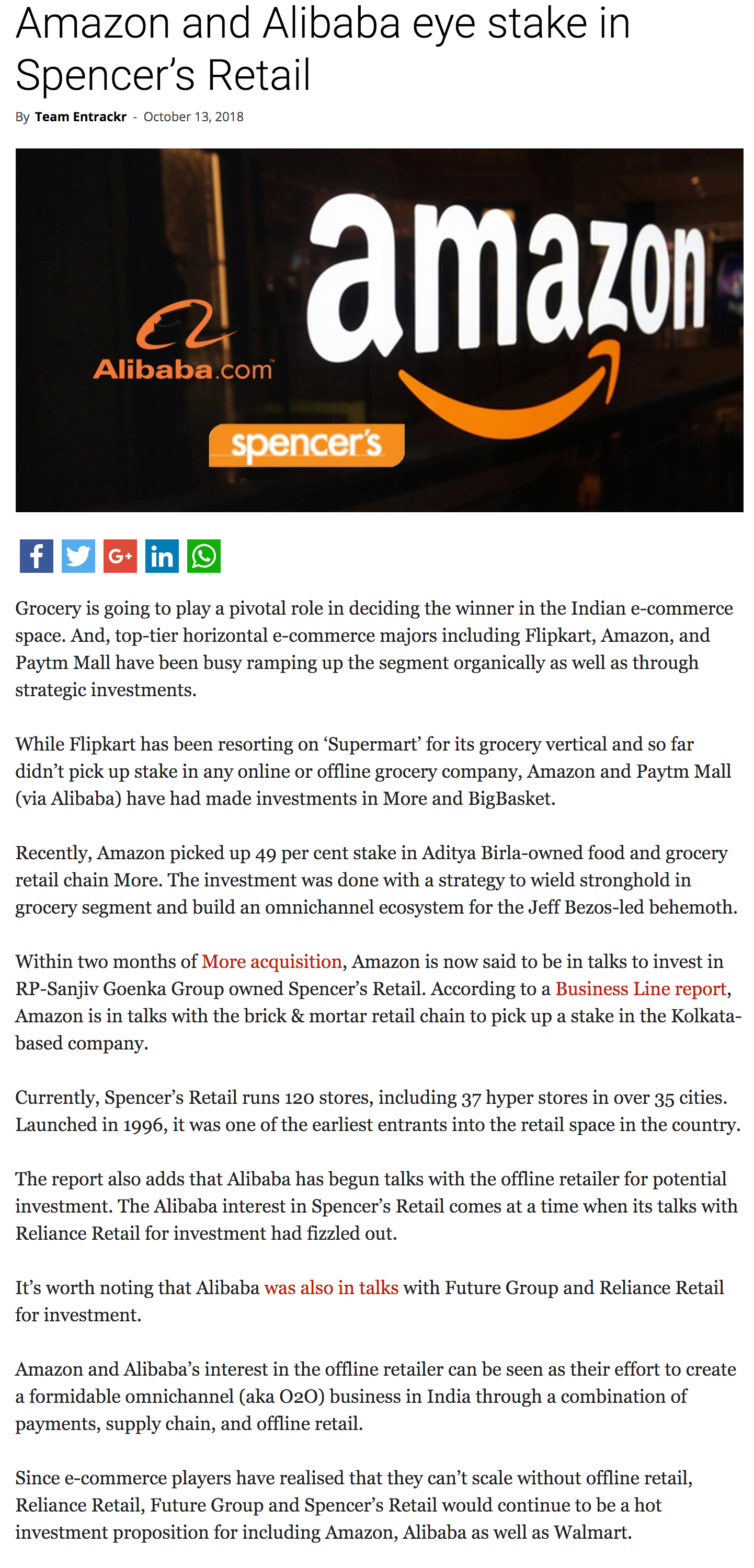 消息人士表示,亚马逊出价4亿美元竞购印度零售连锁企业 Spencer’s Retail 的股权,目标可能是30%的股权。交易处于最后阶段,但由于估值问题而搁置。此外,Spencer’s Retail 正与包括阿里巴巴在内的多家公司进行谈判。