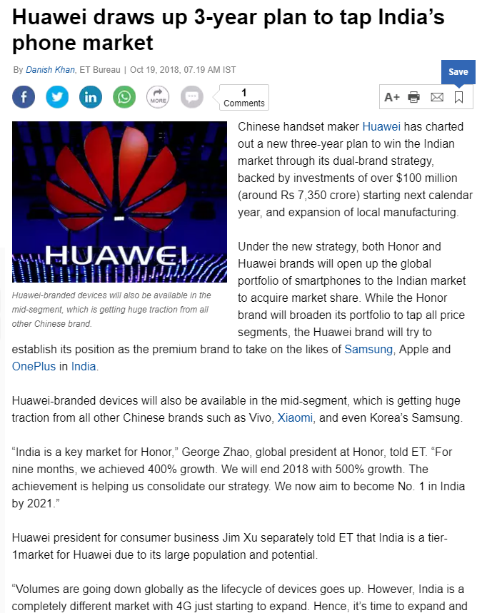 华为制定了一个新的三年计划,力图通过双品牌战略赢得印度市场。他们计划从明年开始向印度投资逾1亿美元,扩大本地生产。荣耀品牌将在印度市场上推出不同价位的手机,而华为品牌将努力确立其高端品牌的地位,在印度与三星、苹果、一加等公司展开竞争。