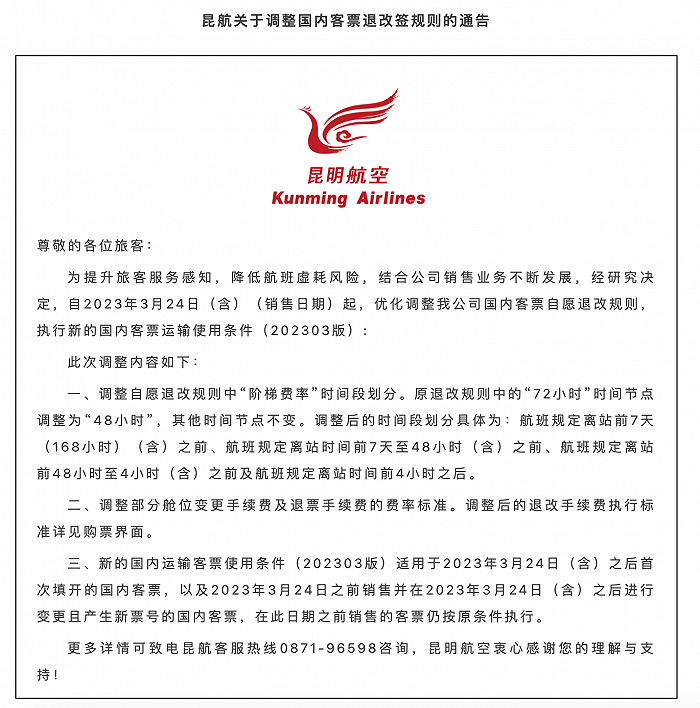 昆明航空调整国内客票退改签规则,阶梯费率中72小时时间节点调整为48小时。