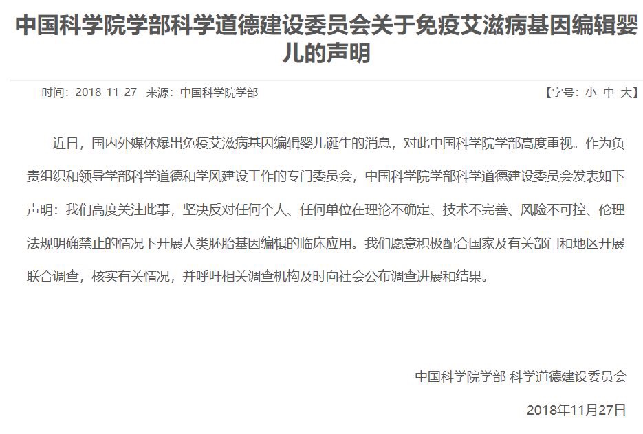 中科院学部关于免疫艾滋病基因编辑婴儿的声明:我们高度关注此事,坚决反对任何个人、任何单位在理论不确定、技术不完善、风险不可控、伦理法规明确禁止的情况下开展人类胚胎基因编辑的临床应用。我们愿意积极配合国家及有关部门和地区开展联合调查,核实有关情况,并呼吁相关调查机构及时向社会公布调查进展和结果。