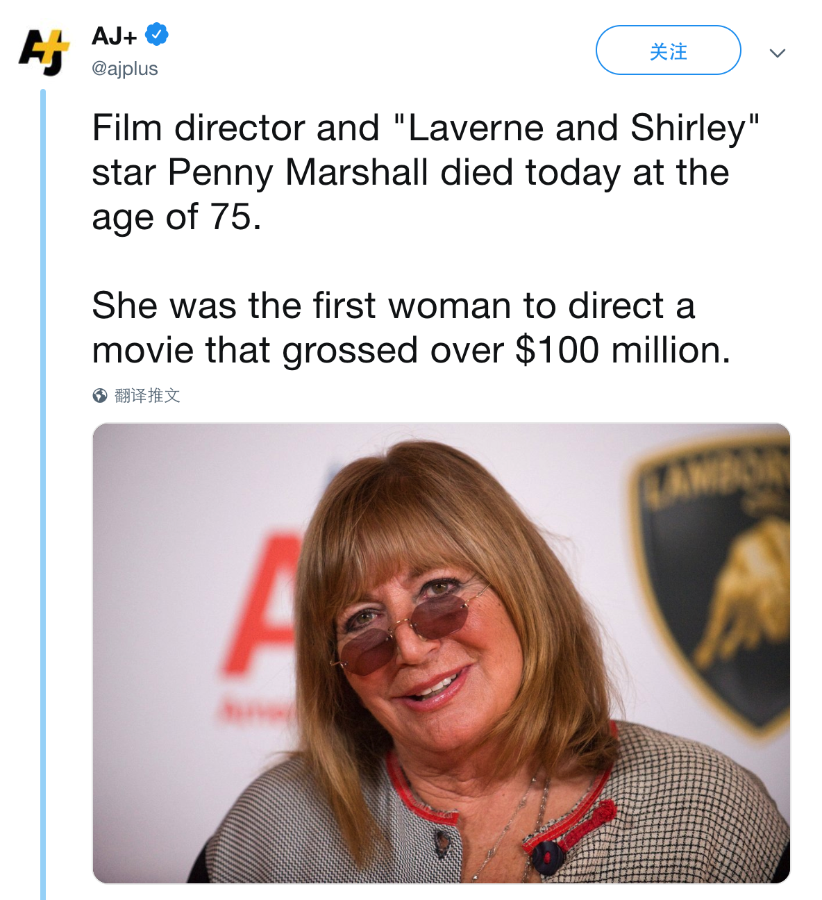 好莱坞知名导演、演员、制作人潘妮·马歇尔去世,享年75岁。死因是糖尿病的并发症。