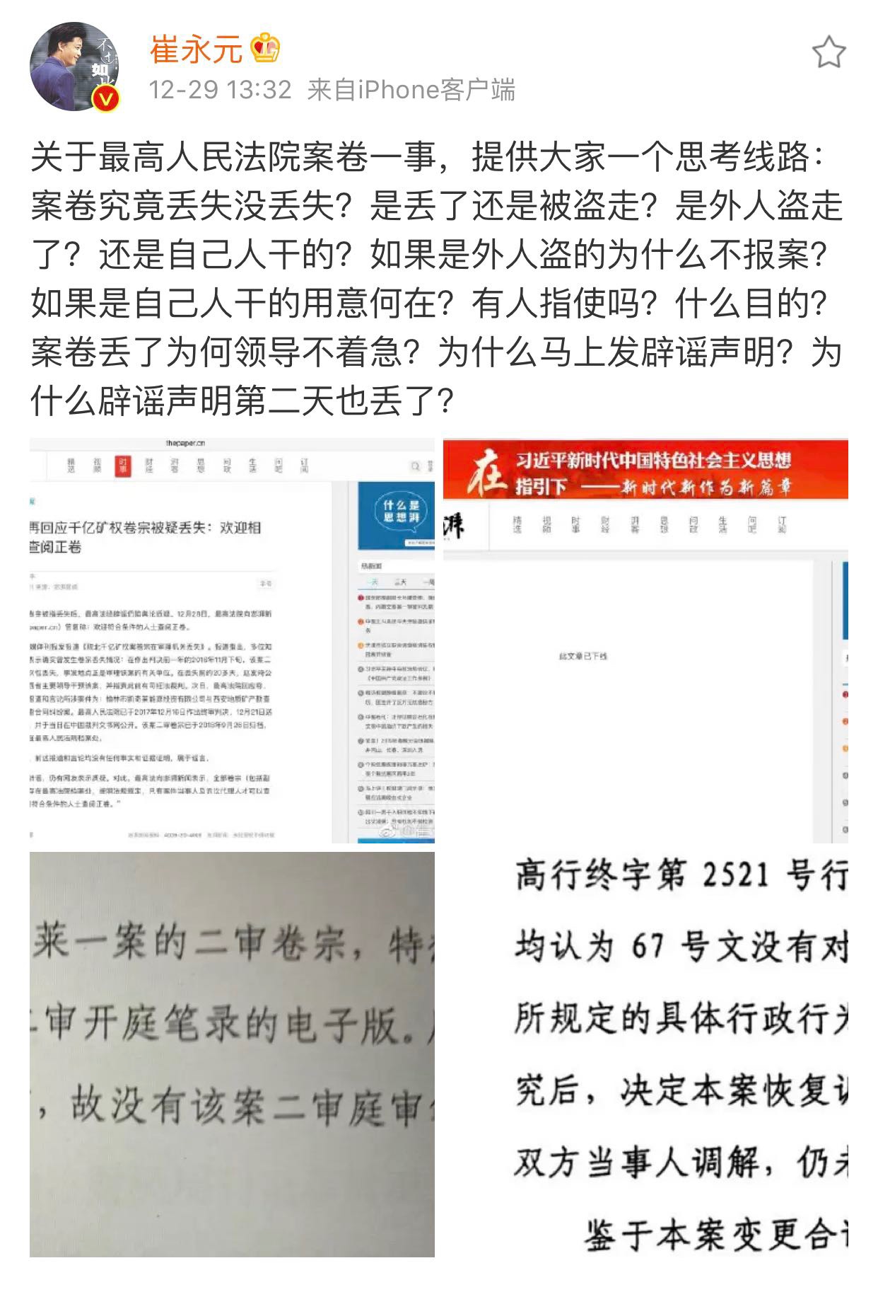29日,崔永元贴图质疑陕北千亿矿权案卷宗在审理机关丢失:“究竟丢失没丢失?是外人盗走了?还是自己人干的?”