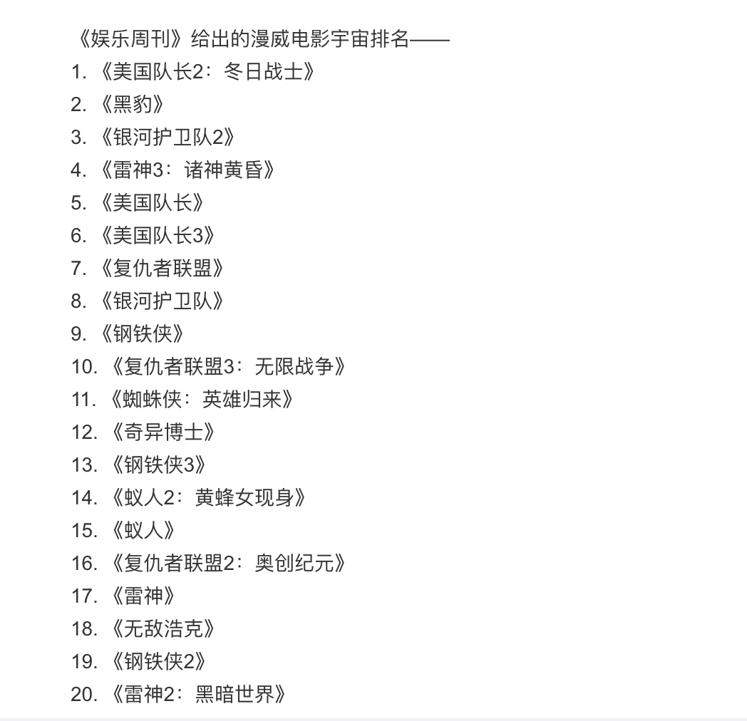 美国《娱乐周刊》为MCU漫威电影宇宙的20部影片进行了排名,这个排名主要是参考影片的口碑,还有该周刊编辑部成员对影片的评分。你喜欢的电影排在第几?