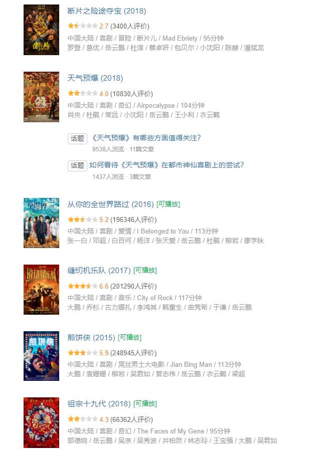 外界调侃郭德纲老拍烂片,其实他的爱徒岳云鹏也不遑多让,参演的电影最高评分6.6分,新作《断片之险途夺宝》更是烂出天际,豆瓣评分低至2.7分,或许烂片定律可以增加一条:凡是岳云鹏参演的电影基本是烂片。
