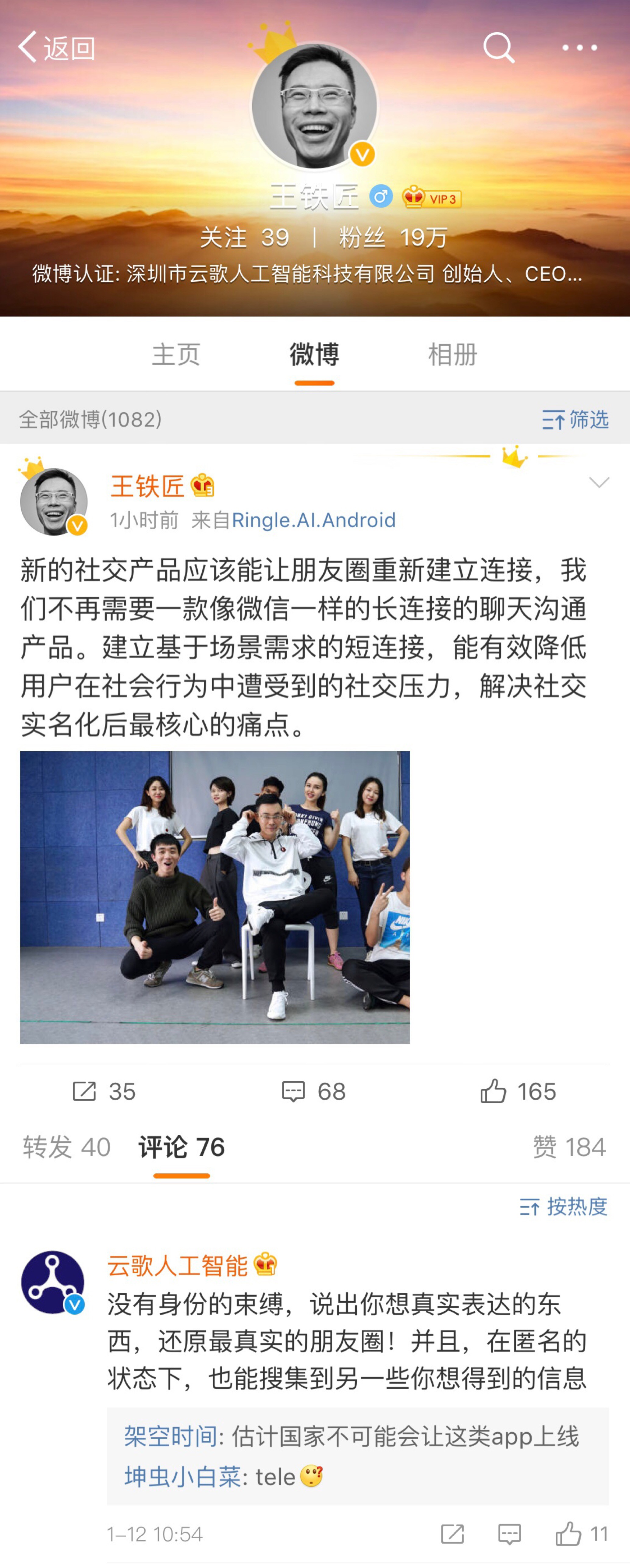对此,云歌人工智能官方微博回复称:该产品“没有身份束缚,说出你想真实表达的东西,还原最真实的朋友圈,并且,在匿名状态下也能搜集到另一些你想得到的信息。”