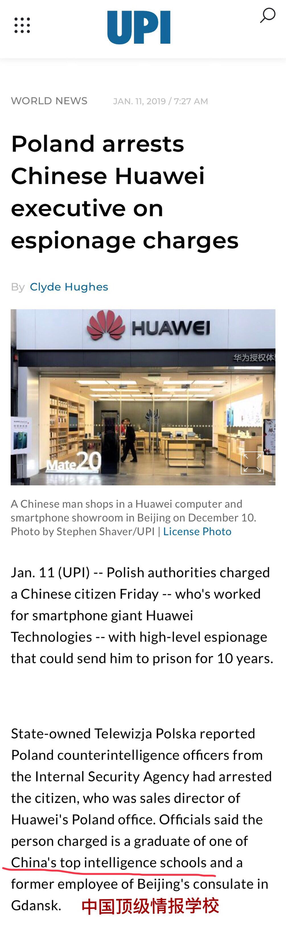 关于华为员工在波兰被捕一事,美国合众社的报道中提及了这样一点:“官方称被指控之人毕业于中国顶级情报学院”,而事实上,被逮捕的华为员工王伟晶毕业于北京外国语大学。