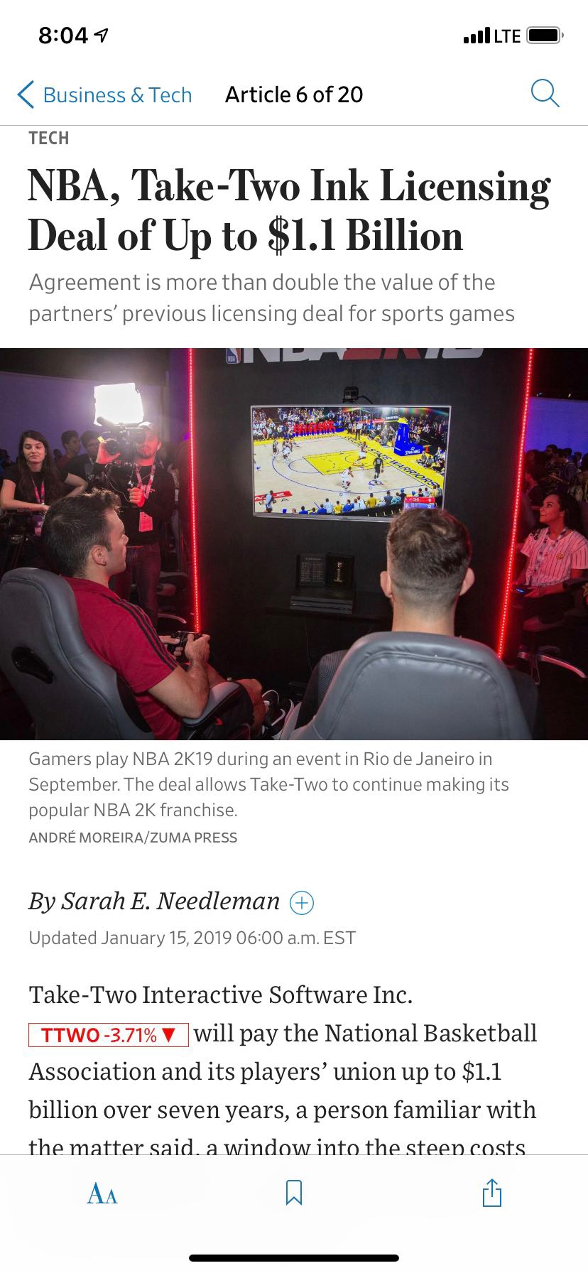 华尔街日报报道- NBA 2000系列游戏的开发商Take 2即将和NBA达成协议,为未来7年继续使用NBA品牌用于其NBA 2000系列游戏和周边产品服务支付11亿美元。
