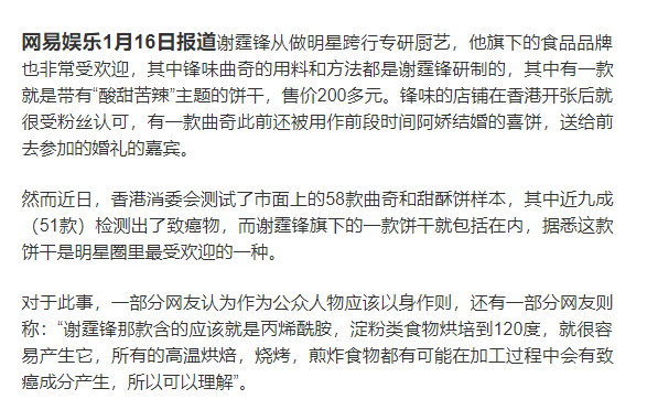 此前,香港消委会测试了市面上58款曲奇和甜酥饼样本,其中近九成(51款)检测出致癌物丙烯酰胺,谢霆锋旗下一款锋味饼干就包含在内。今日下午,谢霆锋就锋味曲奇被检测出丙烯酰胺物质发表了声明,他称:它并非人为加添的物质,而是透过高温烹煮食物如烘焙及煎炸过程中不经意产生的物质,餐厅和家中烹煮食物的过程中都会有机会发现丙烯酰胺。