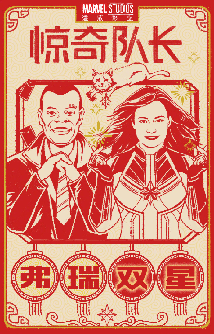 《惊奇队长》拜年海报:“橘猫携惊奇队长和尼克·弗瑞——‘福瑞双星’——祝大家新春快乐!”