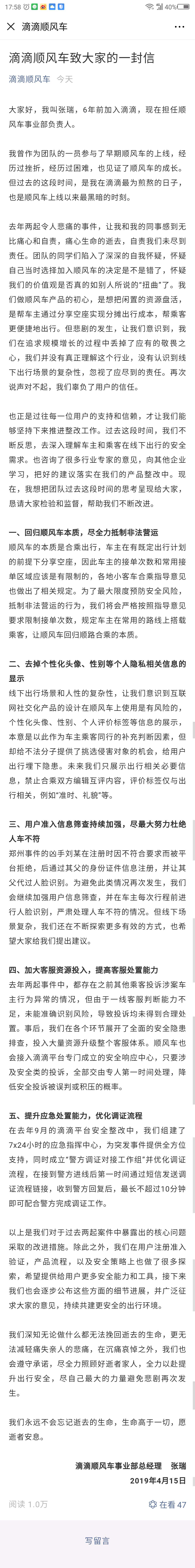 滴滴顺风车公众号发布《滴滴顺风车致大家的一封信》,疑似为业务重新上线做准备。 ​​​