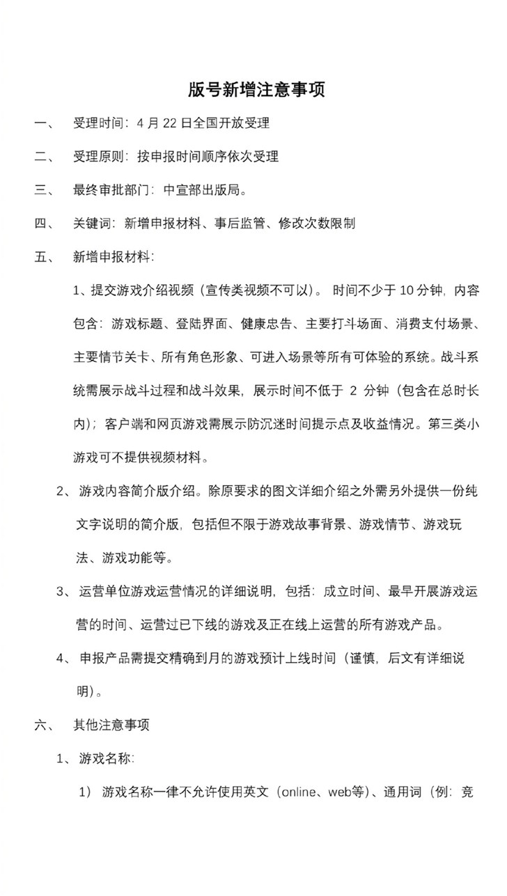本月19日,原国家新闻出版广电总局官网发文宣布游戏版号审批将在4月22日重新开始审批,新增版号审批除了必须的申报材料外,还有其他注意事项。