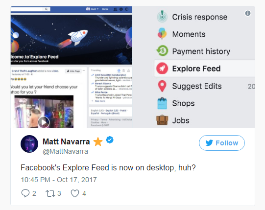 Facebook向桌面用户推出一种被称为“Explore Feed”的动态消息(News Feed)。这项功能旨在帮助用户发现社交网络中的更多内容。比如,用户可能会感兴趣但尚未关注来源的帖子、文章、以及照片或视频。你可以把这些内容理解为基于算法推荐的信息流。