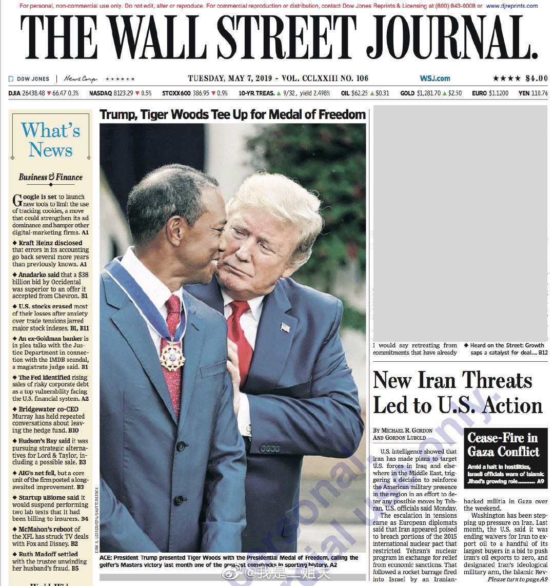 今晨华尔街日报头条--Trump,Tiger Woods Tee Up for Medal of Freedom1. 借位摄影下,两人的嘴就快凑一起了2. 泰格伍兹秃头程度和我差不多讨厌特朗普的可不止中国人啊