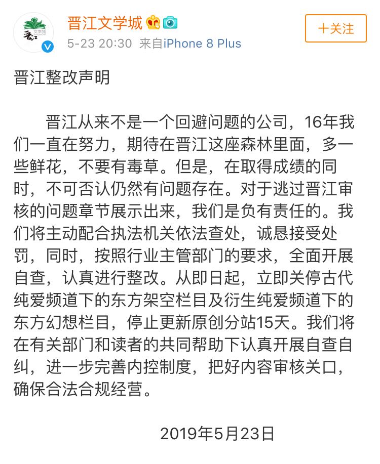 5月23日,针对北京市“扫黄打非”部门查处晋江文学城涉嫌传播淫秽色情信息行为,关闭停更相关栏目、频道,晋江文学城官微发布《晋江整改声明》称, 晋江从来不是一个回避问题的公司,“我们将主动配合执法机关依法查处,诚恳接受处罚,同时,按照行业主管部门的要求,全面开展自查,认真进行整改。”