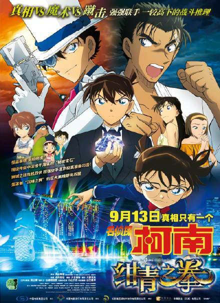 柯南2019年最新剧场版《名侦探柯南:绀青之拳》将于9月13日在中国内地上映。作为平成年代最后一部柯南电影,首次将案件发生地设立在海外,基德时隔四年后再度回归,与柯南合体展开行动。故事围绕着19世纪末与海盗船一同沉入海底、世界上最大的蓝宝石“绀青之拳”展开。
