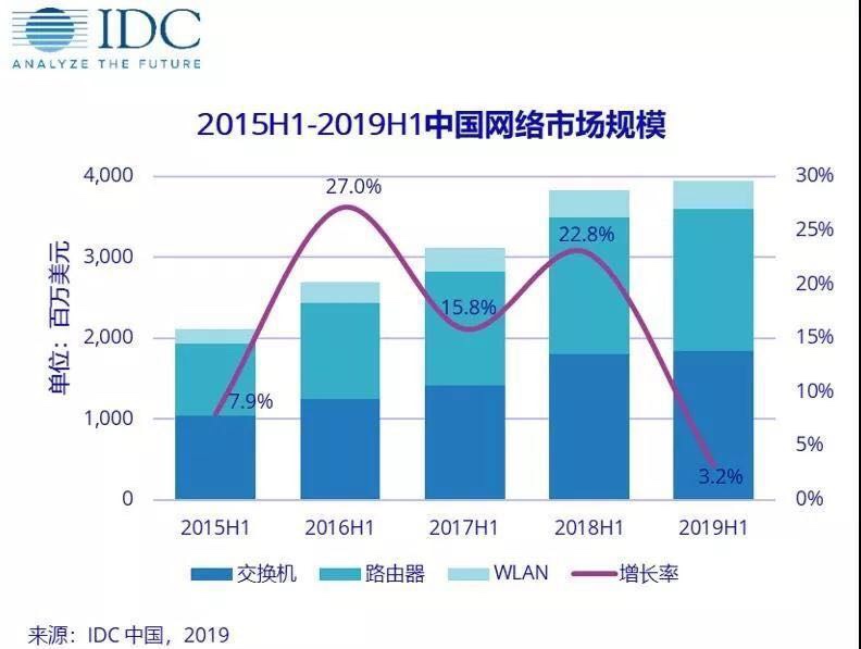 IDC《2019上半年中国网络市场跟踪报告》显示,2019上半年中国网络市场规模为39.5亿美元(约合268亿元人民币),与去年同期相比增长3.2%,增长态势放缓。政府、互联网、教育和服务成为拉动网络市场增量的主要行业。