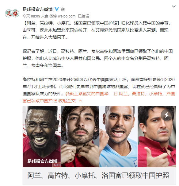 据足球报报道,高拉特、阿兰、费尔南多和阿洛伊西奥已领取了他们的中国护照,他们从此成为中华人民共和国公民。四个人的中文名分别是高拉特、阿兰、费南多和洛国富。高拉特和阿兰在2020年开始就可以代表中国国家队上场,而费南多则要等到2020年7月才上场资格。而比他们更早来到中国踢球的洛国富,现在就已经具备了为中国国家队效力的条件。