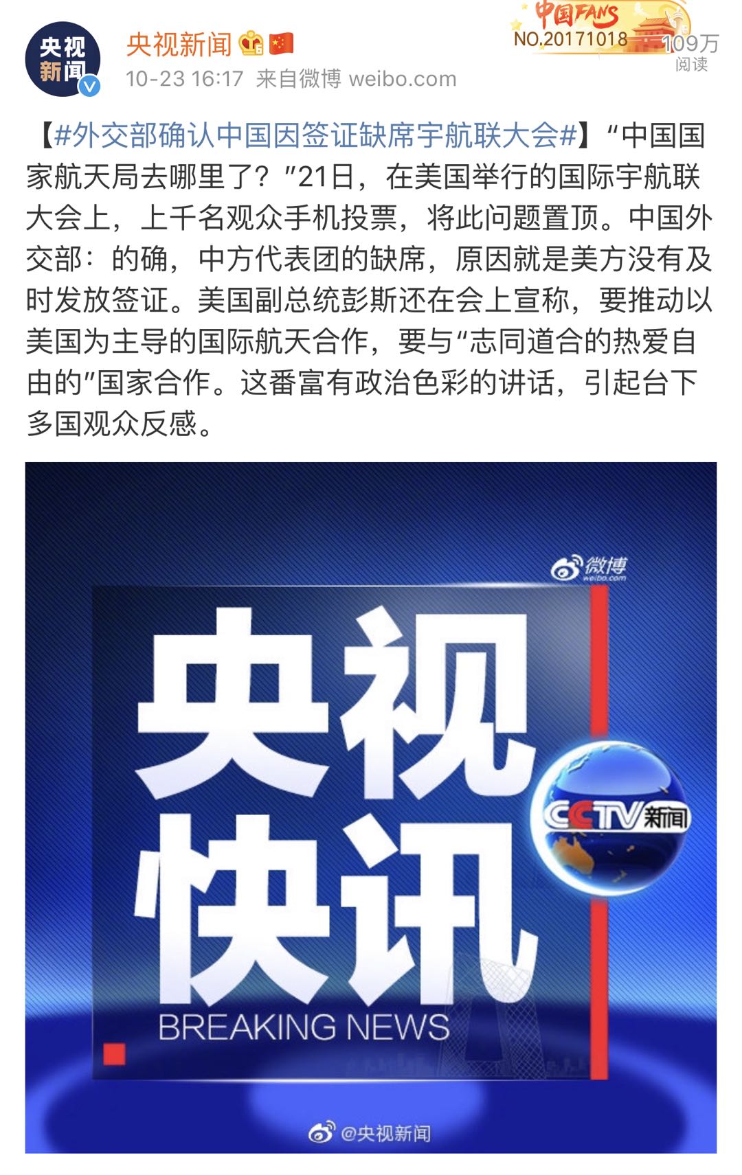 外交部确认中国因签证缺席宇航联大会。
