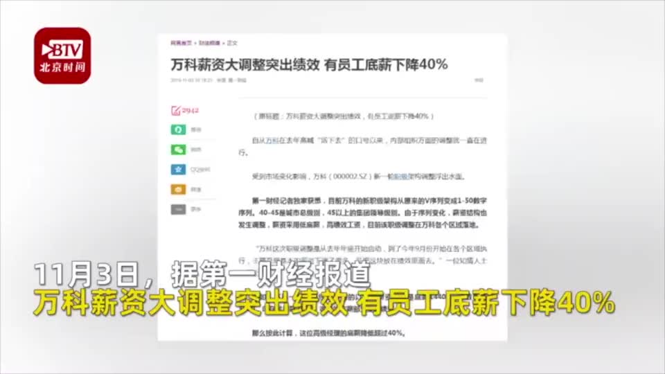 11月3日,据第一财经报道,受到市场变化影响,万科新一轮职级架构调整浮出水面。知情人称“万科这次职级调整从去年年底开始启动,主要是把基本的薪资下调了很多,并把这块放在绩效里面去。”按此调整,部分高级经理的底薪降低超过40%,这并非万科第一次实行薪酬改革。
