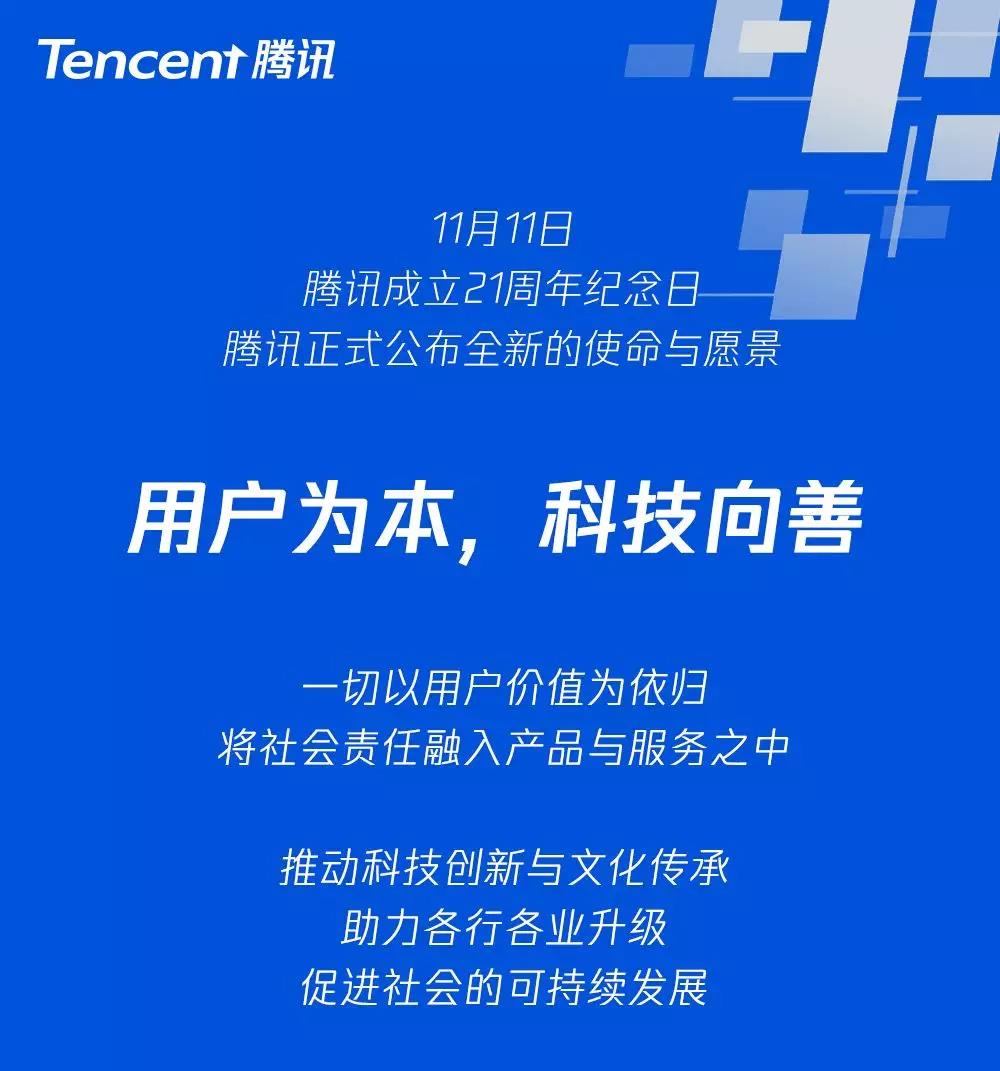 腾讯公布全新使命与愿景:用户为本,科技向善。