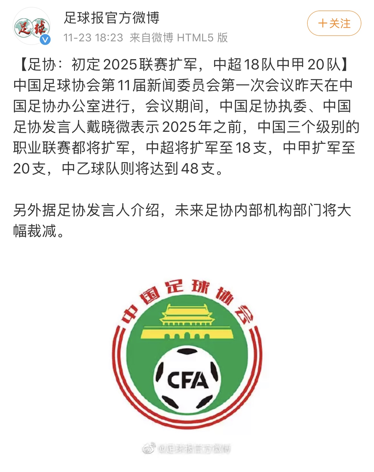 足协:初定2025联赛扩军,中超18队中甲20队。