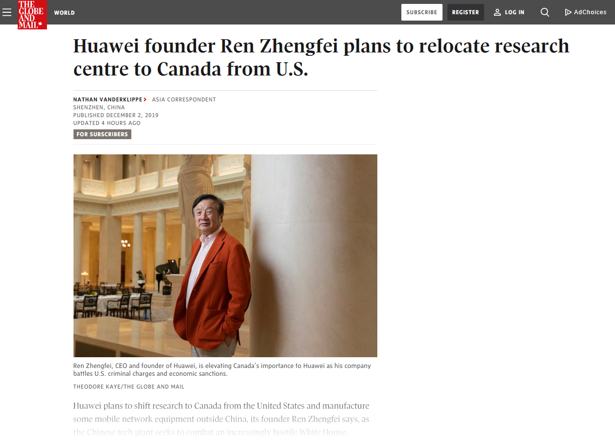 任正非:华为研发中心将从美国迁至加拿大。