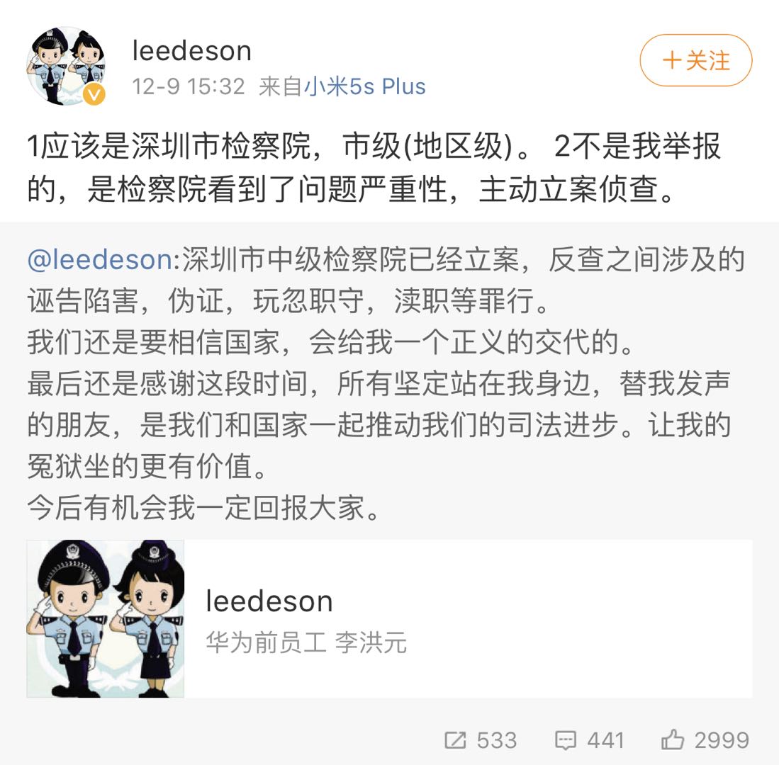 12月9日,华为前员工李洪元发文称,针对“251事件”,深圳市检察院已经立案,反查之间涉及的诬告陷害,伪证,玩忽职守,渎职等罪行。他强调,“不是我举报的,是检察院看到了问题严重性,主动立案侦查。”