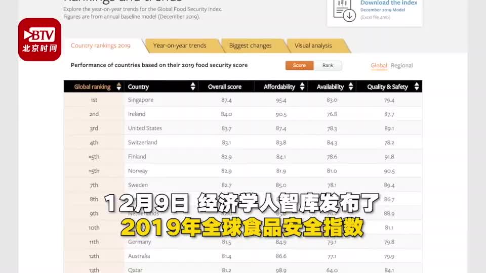 12月9日,经济学人智库发布了2019年全球食品安全指数,在全球113个国家和地区中,新加坡以87.4的综合得分连续第二年位居榜首,中国食品安全排世界35位,爱尔兰和美国排名二、三。据报告,全球范围内的食品价格正在上涨,委内瑞拉和叙利亚的上涨最为显著。