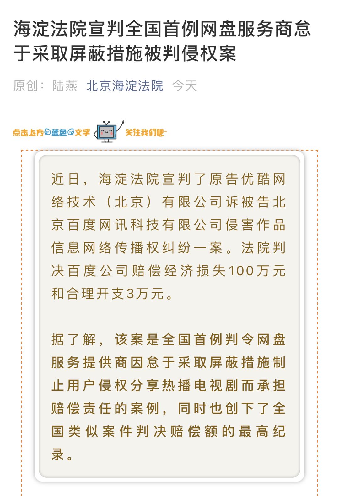 据北京海淀法院官方公众号,近日,海淀法院宣判了原告优酷网络技术(北京)有限公司诉被告北京百度网讯科技有限公司侵害作品信息网络传播权纠纷一案。法院判决百度公司赔偿经济损失100万元和合理开支3万元。据了解,该案是全国首例判令网盘服务提供商因怠于采取屏蔽措施制止用户侵权分享热播电视剧而承担赔偿责任的案例,同时也创下了全国类似案件判决赔偿额的最高纪录。