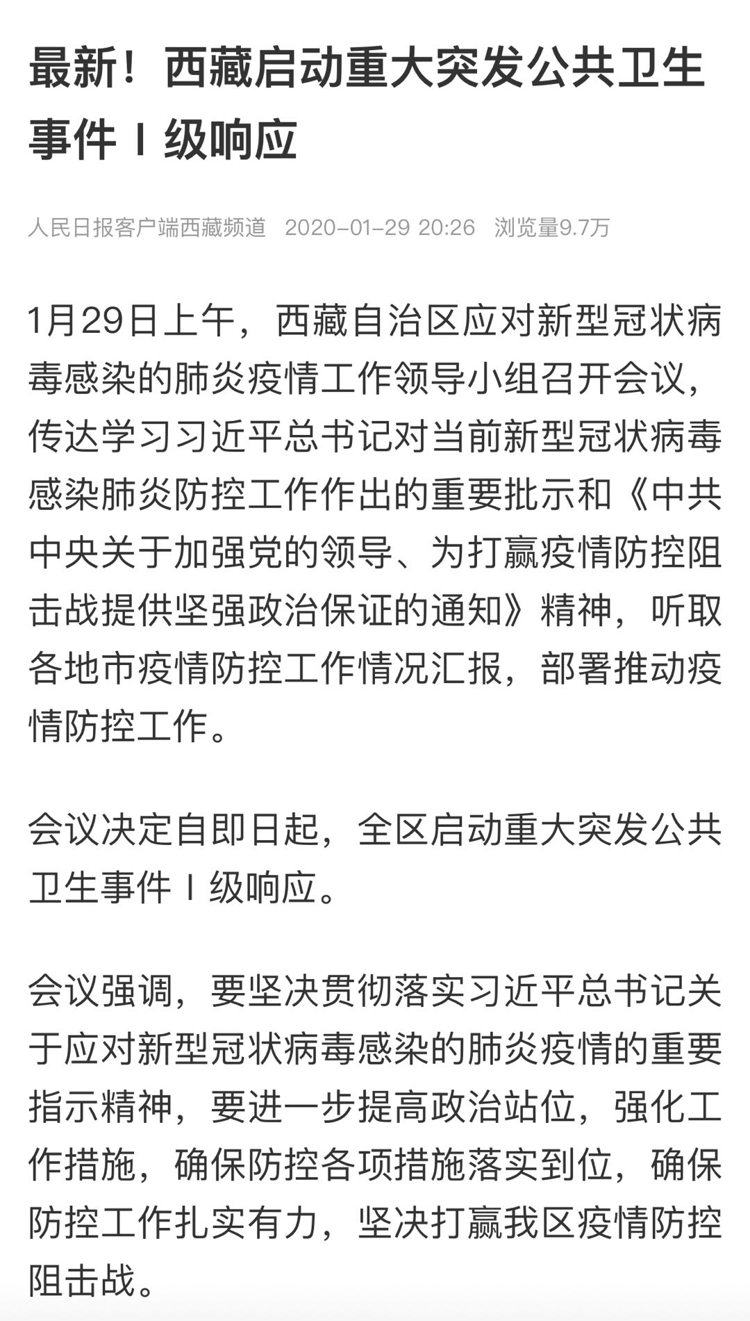 1月29日,据人民日报,西藏启动重大突发公共卫生事件Ⅰ级响应。