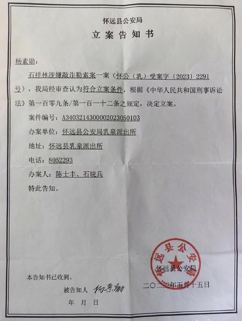 据澎湃新闻,因涉嫌敲诈勒索46万元,安徽怀远人石祥林被警方立案侦查。5月26日,石祥林家人及控告人杨素勋等人向澎湃证实了这一消息。石祥林的母亲2018年因颅脑损伤医治无效,被摘取肝脏、肾脏,牵出一桩刑案。此案涉及6人,包括安徽、江苏两地的4名医生,后来又查出另外10起摘取人体器官案。2020年7月,怀远县法院以毁坏尸体罪判处黄新立、杨素勋等6人有期徒刑。