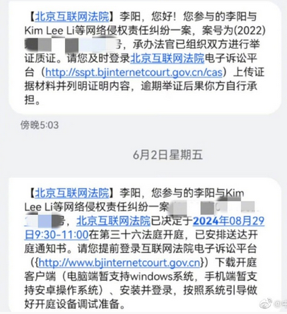 据红星新闻,记者从李阳处了解到,李阳2021年12月起诉前妻Kim一案,因起诉后无法联系上Kim导致案件无法进行审理,北京互联网法院2023年5月已裁定同意李阳撤诉的请求。而在此次撤诉后,李阳近日又重新对前妻Kim女士进行起诉,北京互联网法院已确定在2024年8月29日开庭审理。李阳陷“家暴”风波已持续10余年。据媒体公开报道显示,2011年,前妻Kim曾在社交媒体上公开曝光李阳对她实施家庭暴力,并发布了数张照片作为证据。