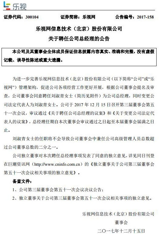 乐视管理层又变动了,今天下午,乐视网发布公告称,公司董事会将聘任刘淑青女士为公司总经理,同时变更公司法定代表人为刘淑青女士。此外,监事吉晓庆因个人原因辞职,同时辞去在公司的其他职务;刘弘因个人原因申请辞去副总经理职务,但仍将担任公司董事会战略委员会委员及副董事长职务。