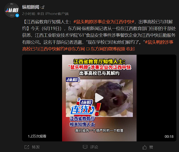 据东方网,6月17日,全民关注的“鼠头鸭脖”一事终有盖棺定论,相关涉事企业究竟是谁仍是未解之谜。6月19日,记者从江西省教育厅相关部门与江西省多家高校后勤管理部门等多方交叉印证确认,涉事食堂供应商为江西中快后勤服务有限公司,目前该涉事学校江西工业职业技术学院已与该公司解约。