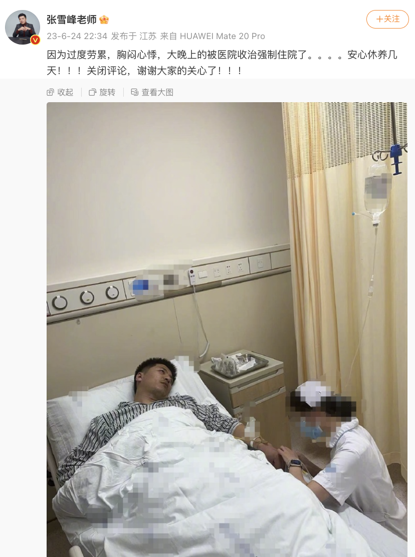 知名教育博主张雪峰自曝过度劳累被强制住院:安心休养几天,关闭评论!