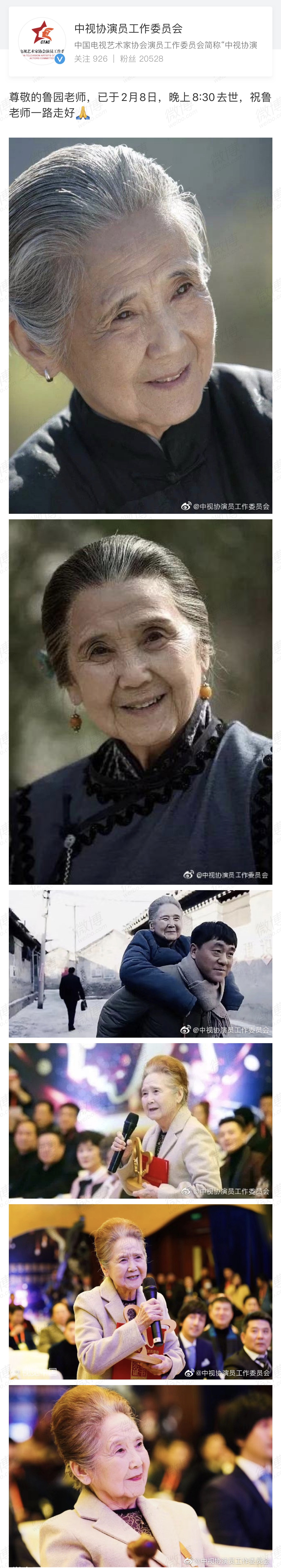 @中视协演员工作委员会 发布讣告,“尊敬的鲁园老师已于2月8日晚上8:30去世”。鲁园生前的代表作有《守望幸福》《女儿情》《情满四合院》《大女当嫁》等,其中《女儿情》获黑龙江省表演一等奖,她也曾在《暖春》中饰演小花的奶奶。