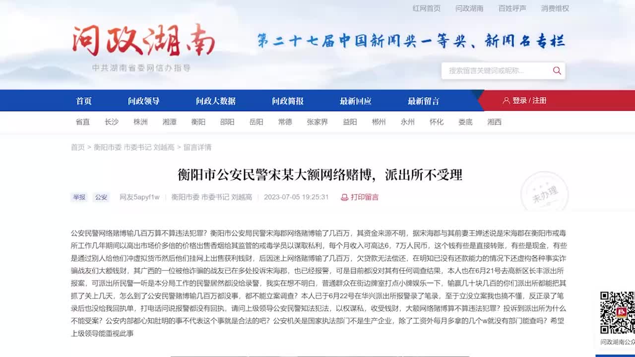 网传衡阳一民警涉赌欠债百万未还,当地纪委回应:已介入调查。