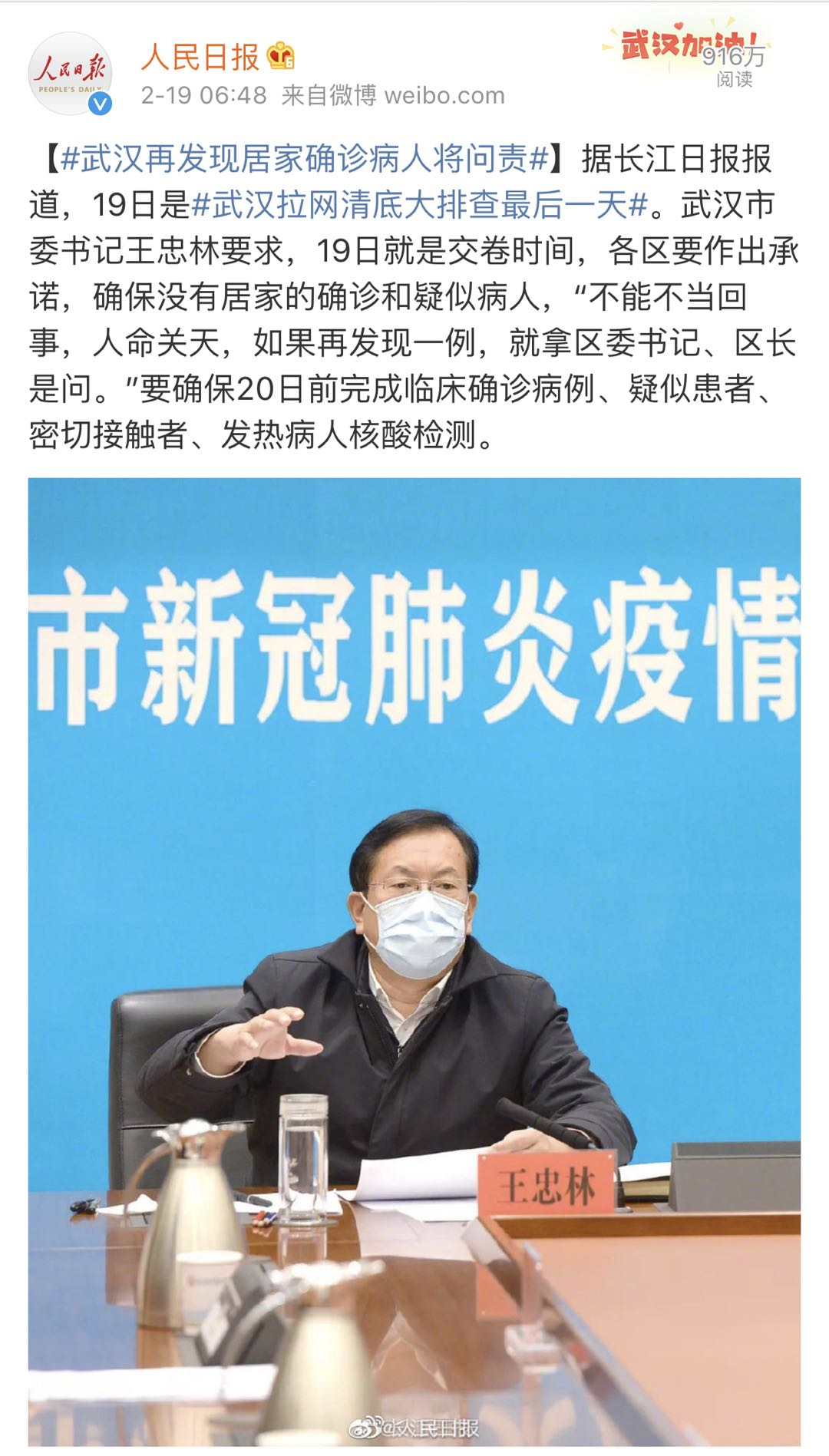 据长江日报报道,19日是武汉拉网清底大排查最后一天。武汉市委书记王忠林要求,19日就是交卷时间,各区要作出承诺,确保没有居家的确诊和疑似病人,“不能不当回事,人命关天,如果再发现一例,就拿区委书记、区长是问。”要确保20日前完成临床确诊病例、疑似患者、密切接触者、发热病人核酸检测。