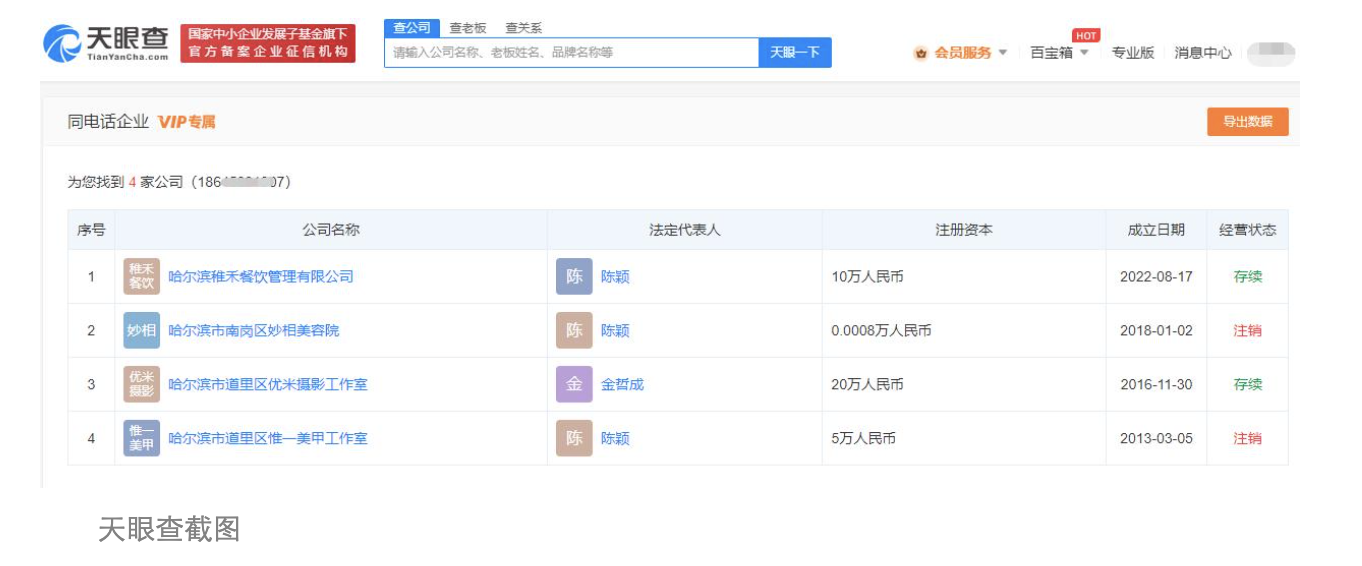 梳理天眼查、爱企查信息,2021年8月,陈颖注销了其在哈尔滨开了8年多的美甲店;这一年9月7日,又注销了开了3年多的美容院。