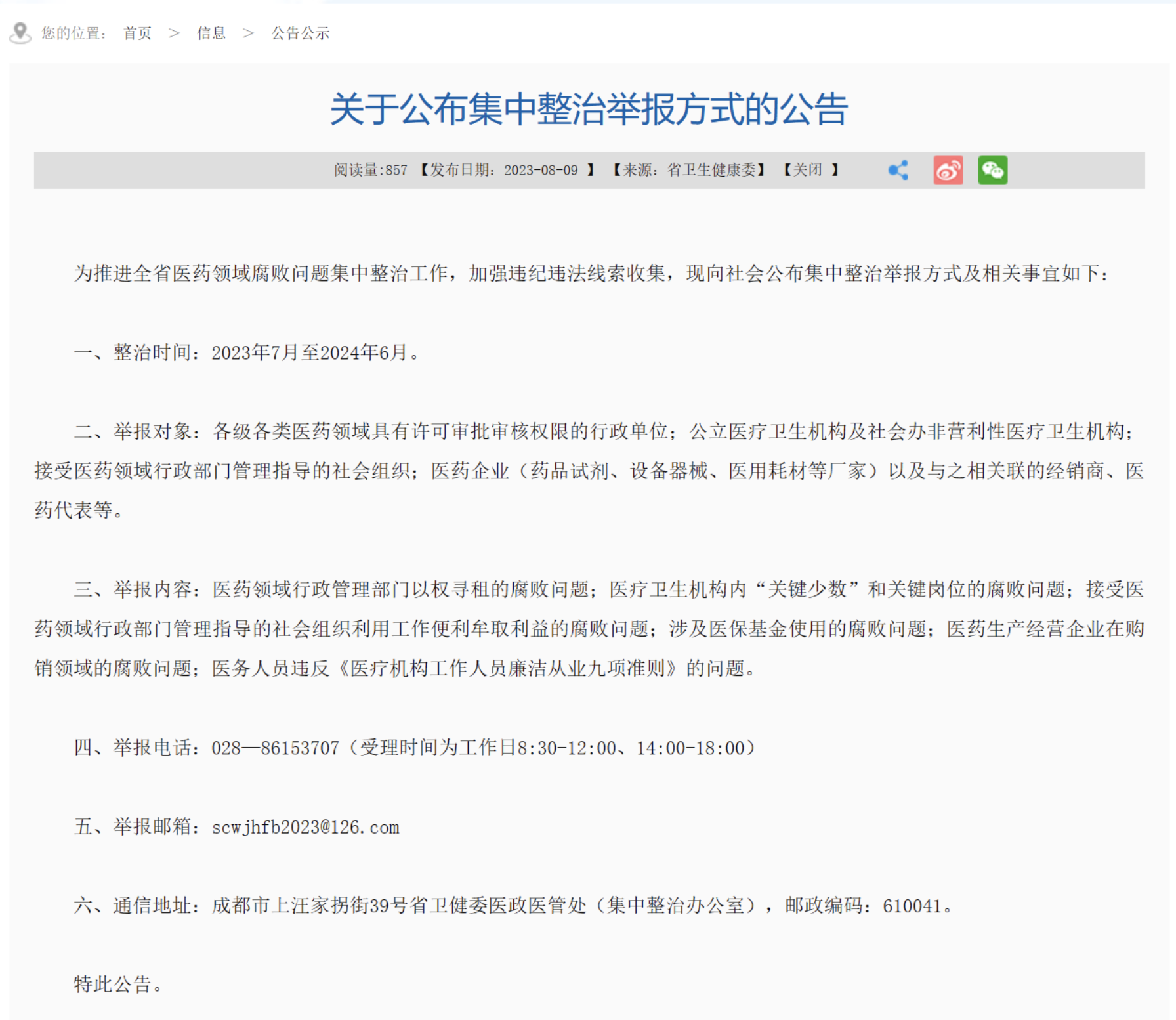 推进医药领域腐败问题集中整治,四川公布举报方式。