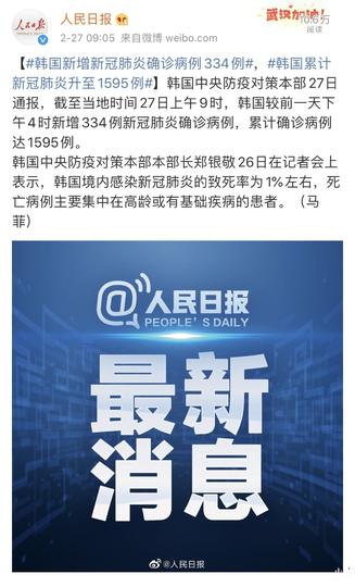 韩国中央防疫对策本部27日通报,截至当地时间27日上午9时,韩国较前一天下午4时新增334例新冠肺炎确诊病例,累计确诊病例达1595例。