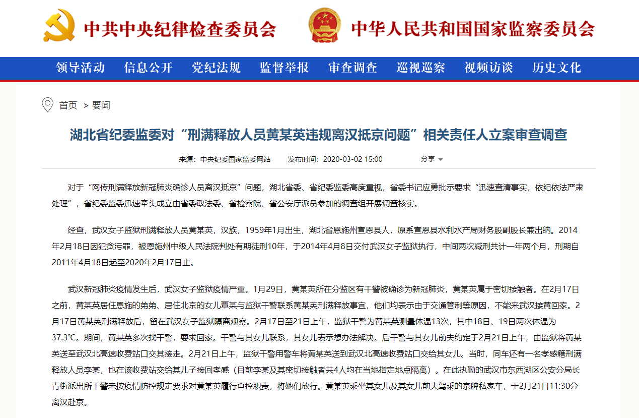 湖北省纪委监委对“刑满释放人员黄某英违规离汉抵京问题”相关责任人立案审查调查。