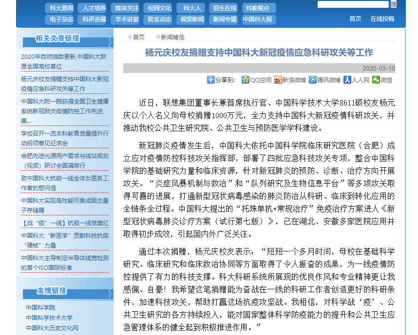 近日,联想集团董事长兼首席执行官、中国科学技术大学校友杨元庆以个人名义向母校捐赠1000万元,以保障中国科大新冠疫情科研攻关,推动中国科大公共卫生研究院、公共卫生与预防医学学科建设。