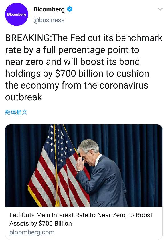 美联储紧急降息100个基点,削减基准利率到0%。