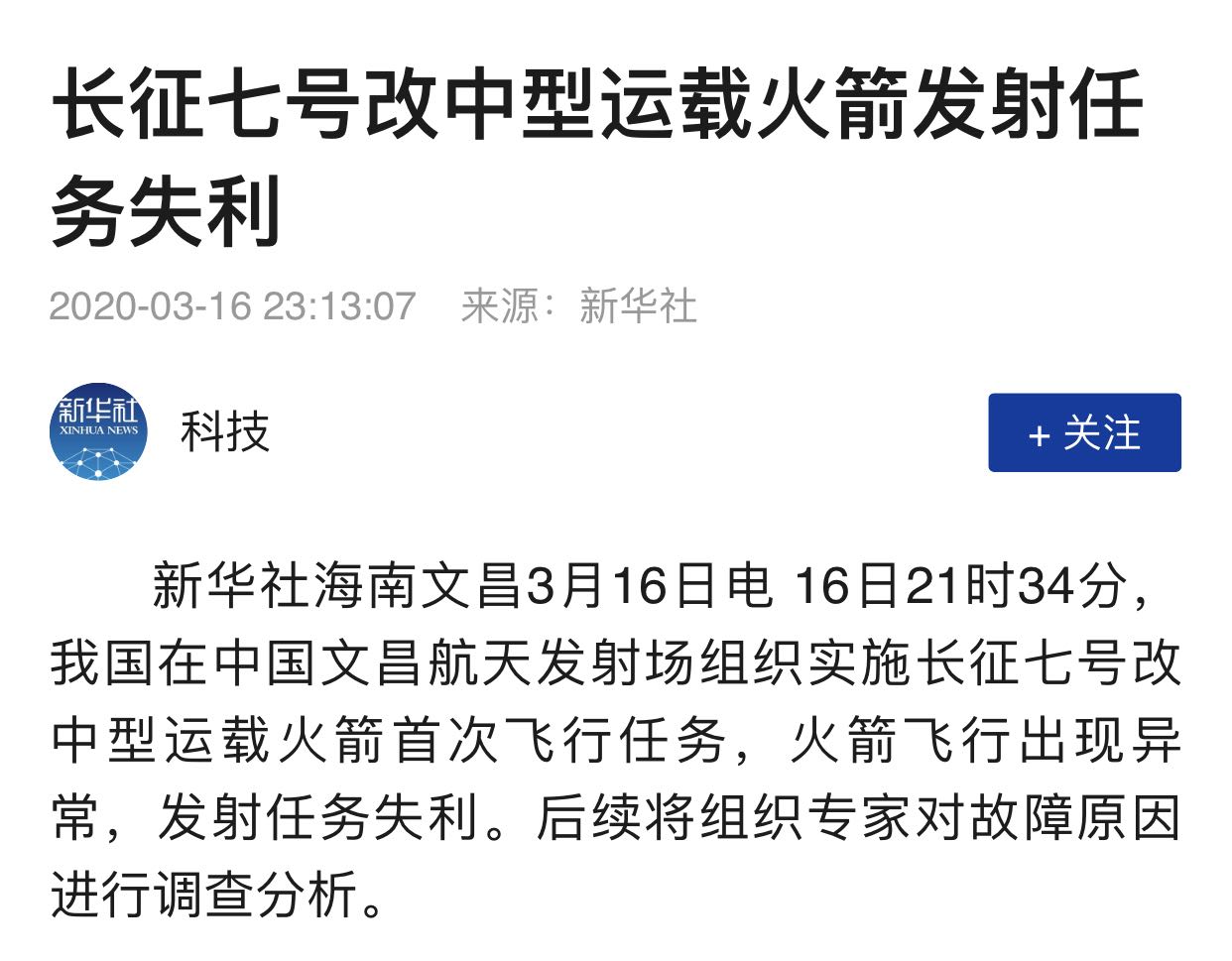 3月16日21时34分,我国在中国文昌航天发射场组织实施长征七号改中型运载火箭首次飞行任务,火箭飞行出现异常,发射任务失利。后续将组织专家对故障原因进行调查分析。