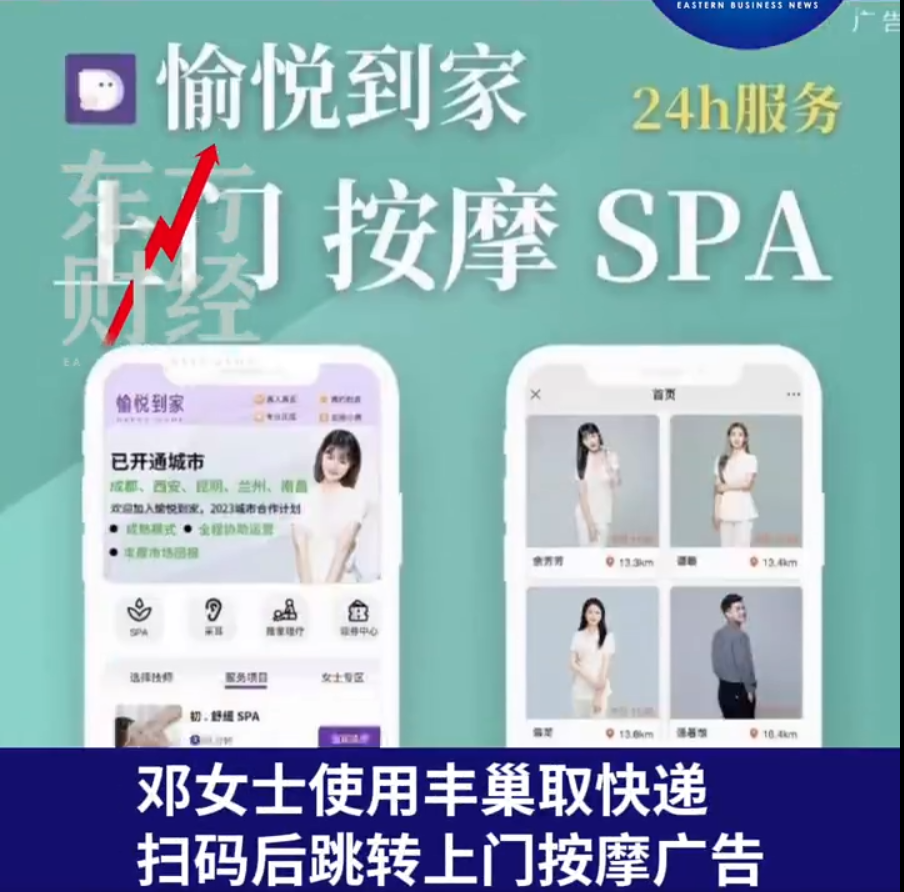 据蓝鲸财经, 11月16日,网友邓女士在丰巢快递柜上扫码取件,扫码后手机页面自动跳转到“上门按摩”的广告,广告页面内容令她感到不适。邓女士告诉记者,“扫了立即取件的二维码,快递柜门打开了,但手机跳转到了这个广告上,它是24小时服务的上门按摩SPA,有一些女性工作人员的照片,我会觉得这是有一点擦边的。”